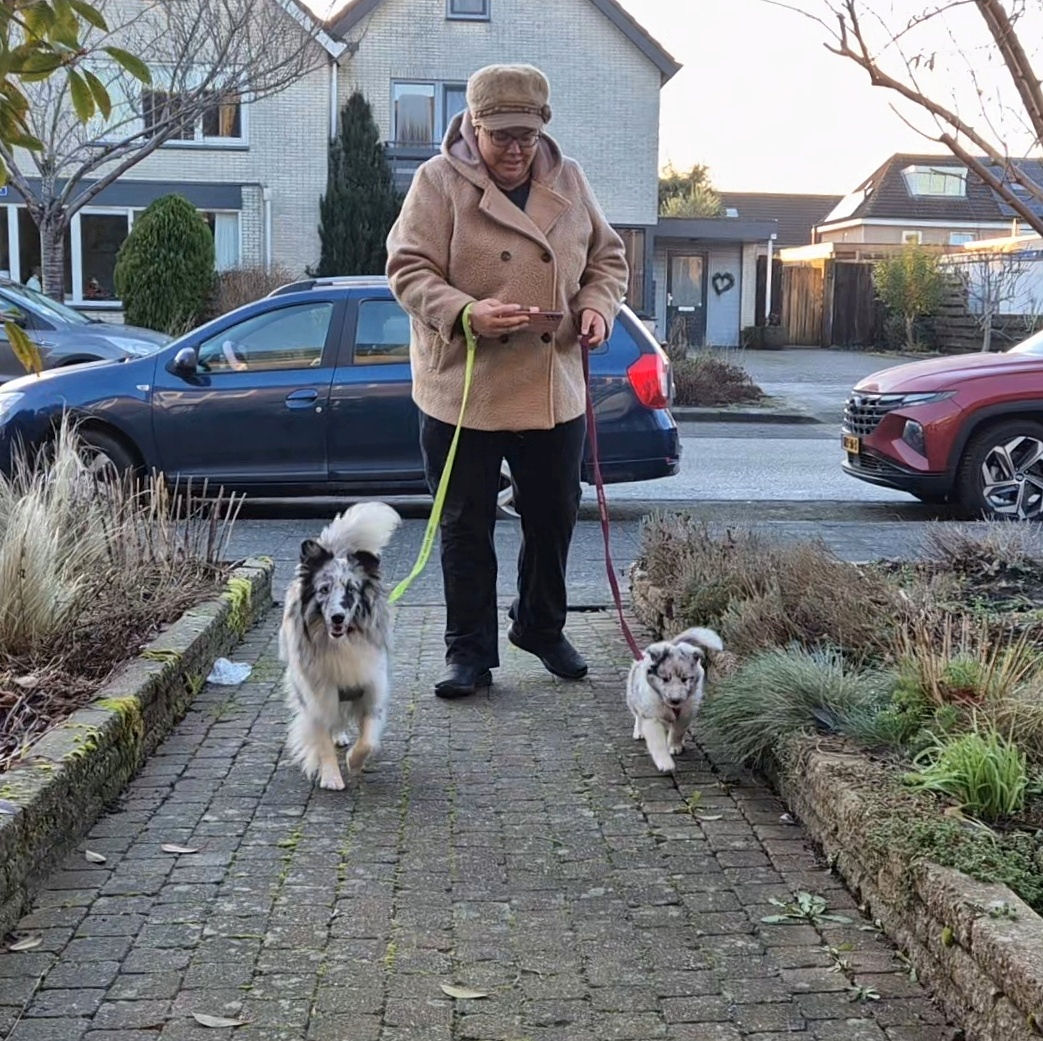 wat natuurlijk niet ideaal is. De grote buitenwereld vindt ze wel nog wat spannend. Het lopen aan de riem ging