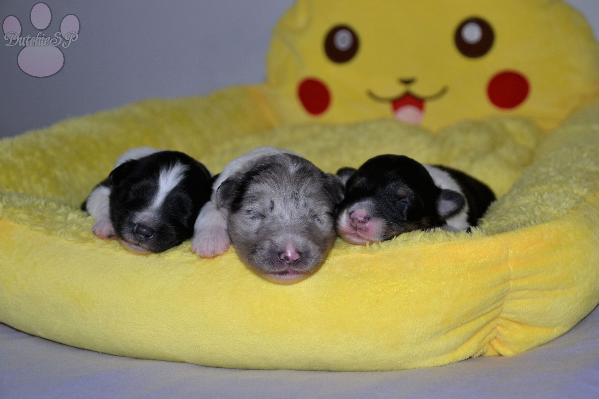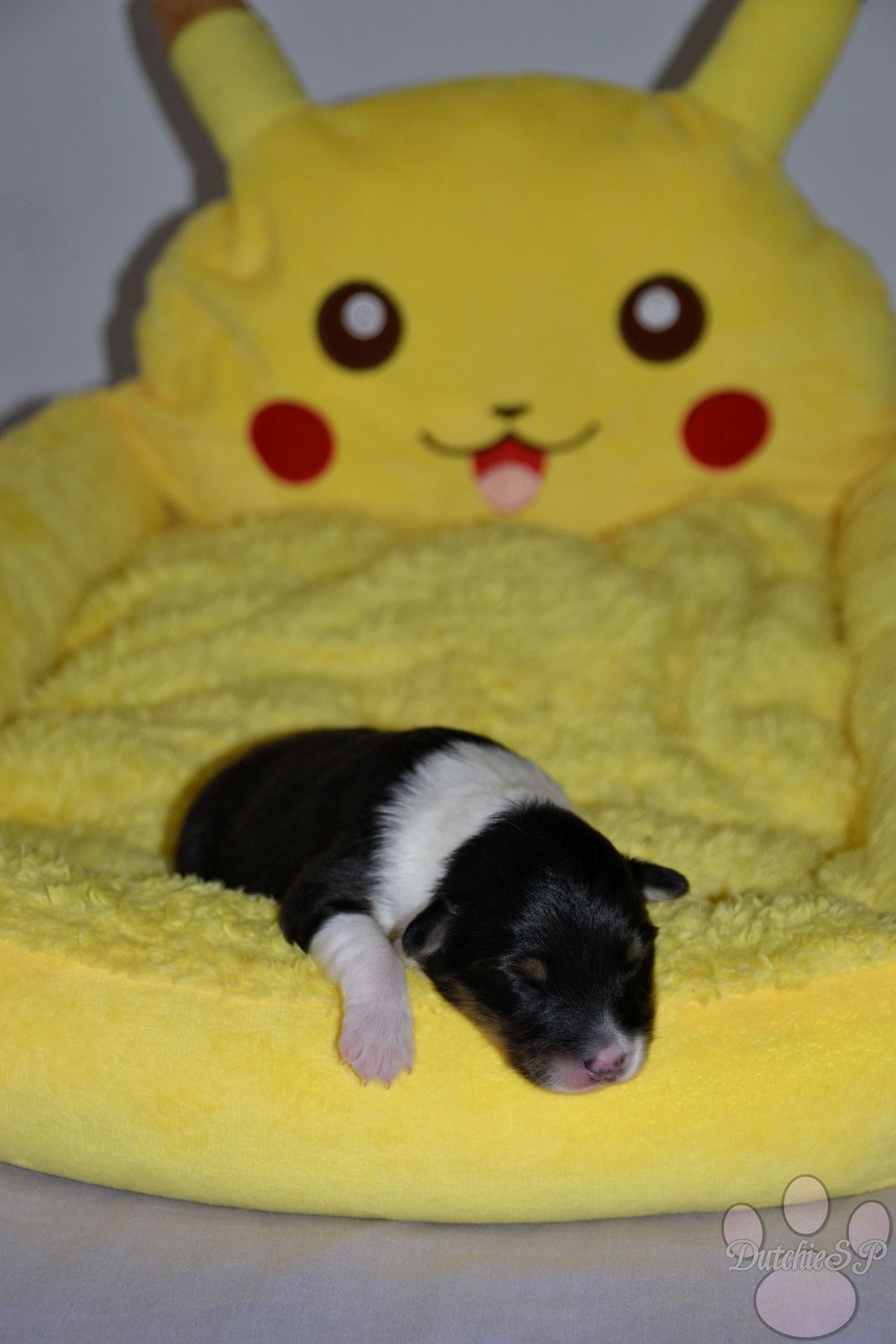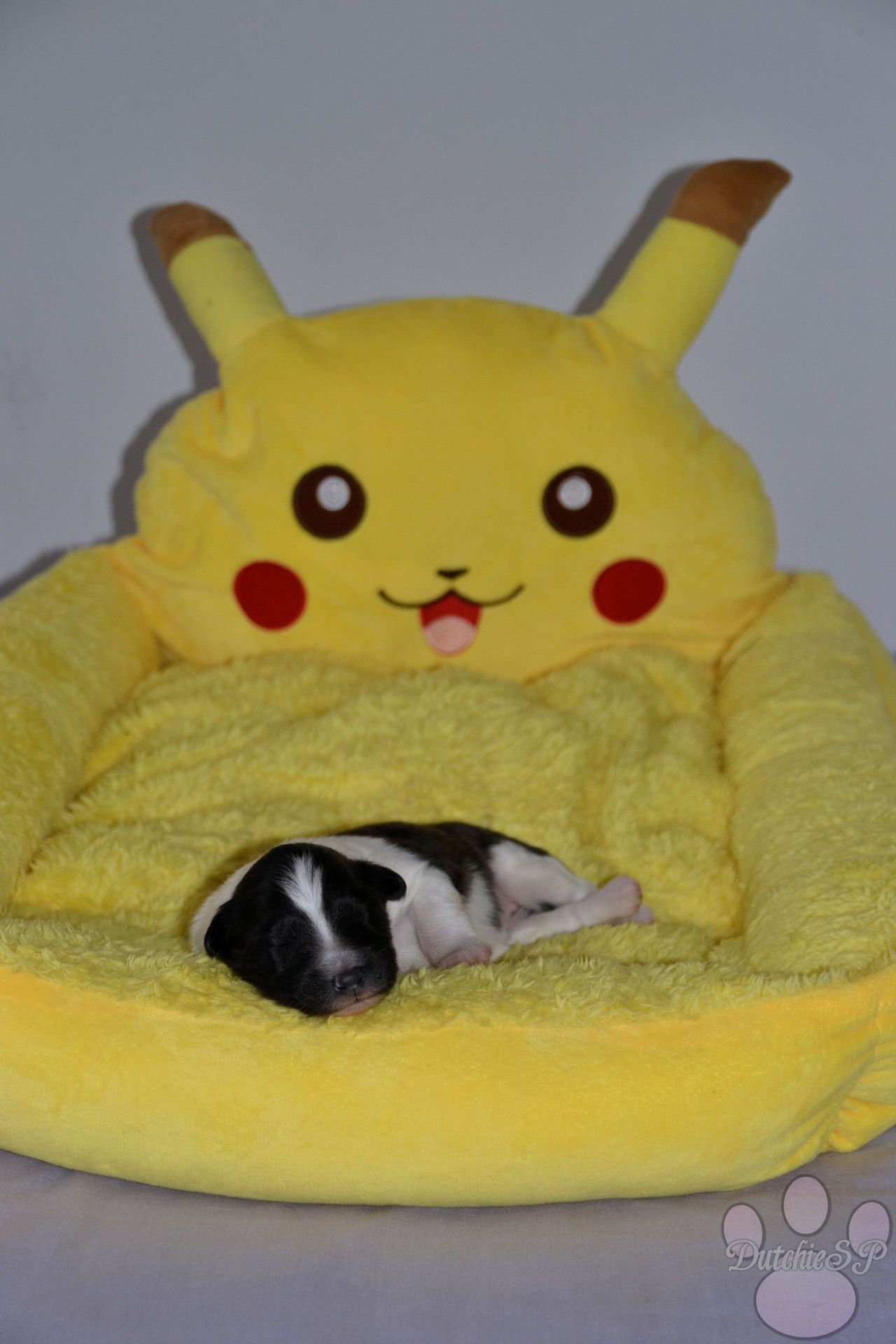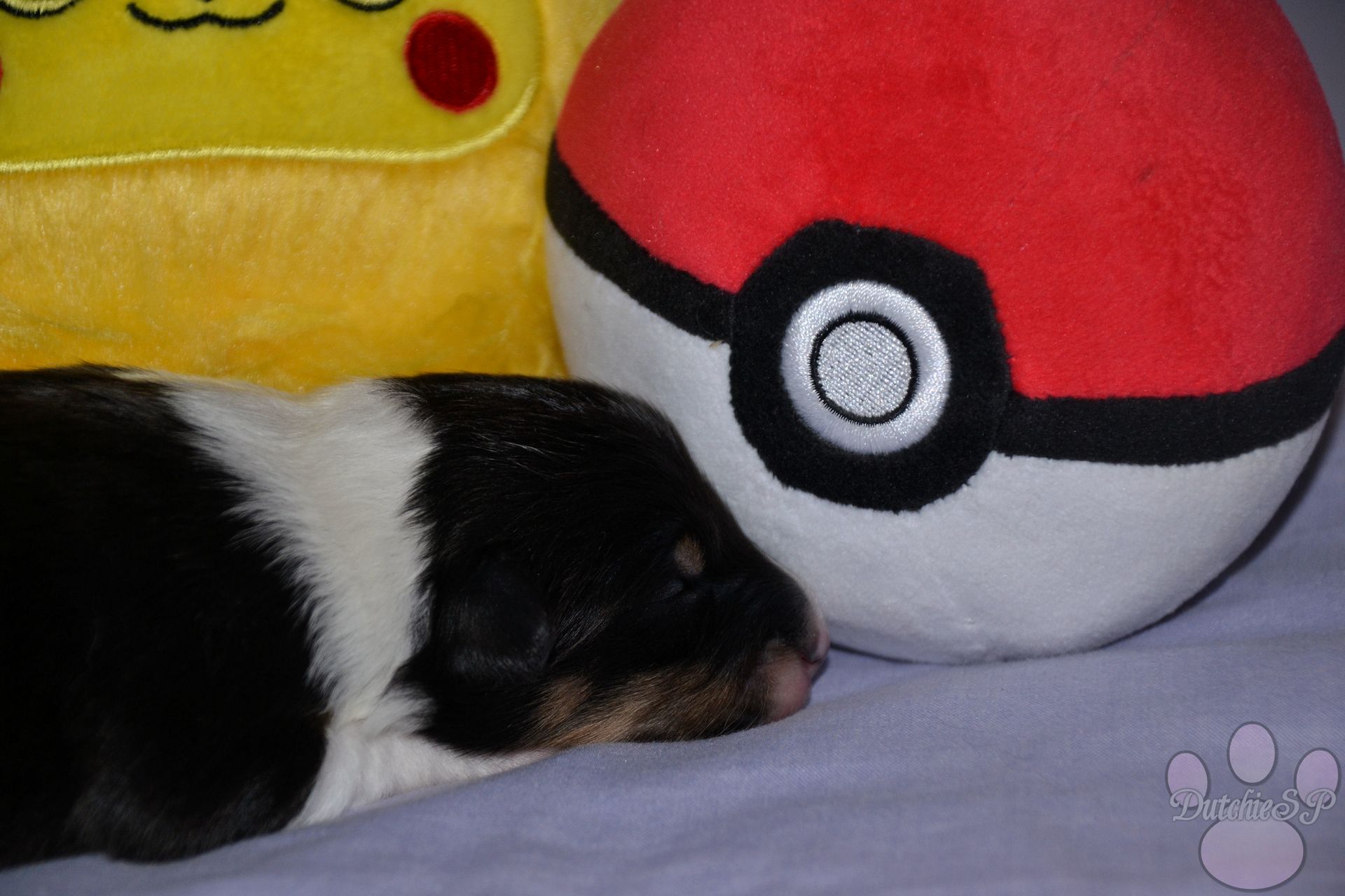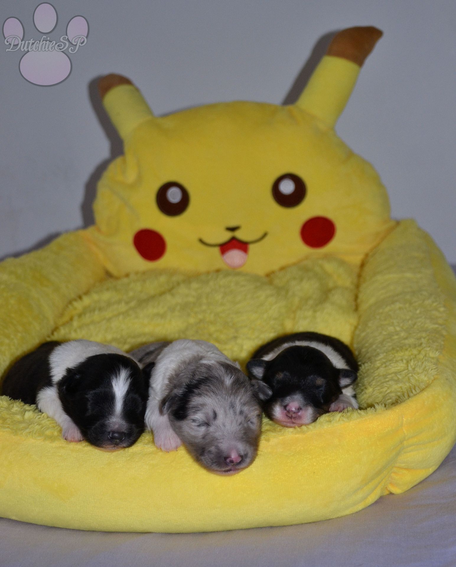Jiggly is de bewegelijke van de groep. Al tijdens de eerste photoshoot kroop ze het hele bed over en nu nog steeds gaat ze met gemak de hele werpkist door. Ze kan wat zeurderig worden als ze knuffels wil maar dit is gemakkelijk op te lossen door een zoen van mama of een slaapje op onze borst. Ze heeft graag een kussen onder haar hoofdje, of dit nu een kruik, een hand, een poot van mama of één van haar zussen is... Zolang het maar zacht ligt. In het geval van de naam van Jiggly was het eerst de 'Jolly' die we hadden bedacht. Jolly, wat jolig betekent, en natuurlijk ook een woord is wat vaak rond de kerstdagen gebruikt wordt vond ik zo leuk dat ik hier gewoon een tweede naam bij wilde bedenken. Nu zijn er niet heel veel Pokémon met namen die met een J beginnen, laat staan schattige. Jigglypuff is zo een Pokémon waar ik niet gelijk aan dacht maar die ik eigenlijk wel super leuk vind. Jigglypuff is een zingende Pokémon wiens stem anderen in slaap kan brengen, iets wat de Pokémon zelf overigens niet op prijs stelt. Hun evolutie vindt plaats op basis van hoe hecht de vriendschap tussen Pokémon en mens is en zo een band hoop ik ook te vinden voor onze Jiggly in het echte leven. Jigglypuff is een speelse Pokémon die gek is op aandacht en dit laatste is nu al toepasselijk op onze puppy Jiggly.