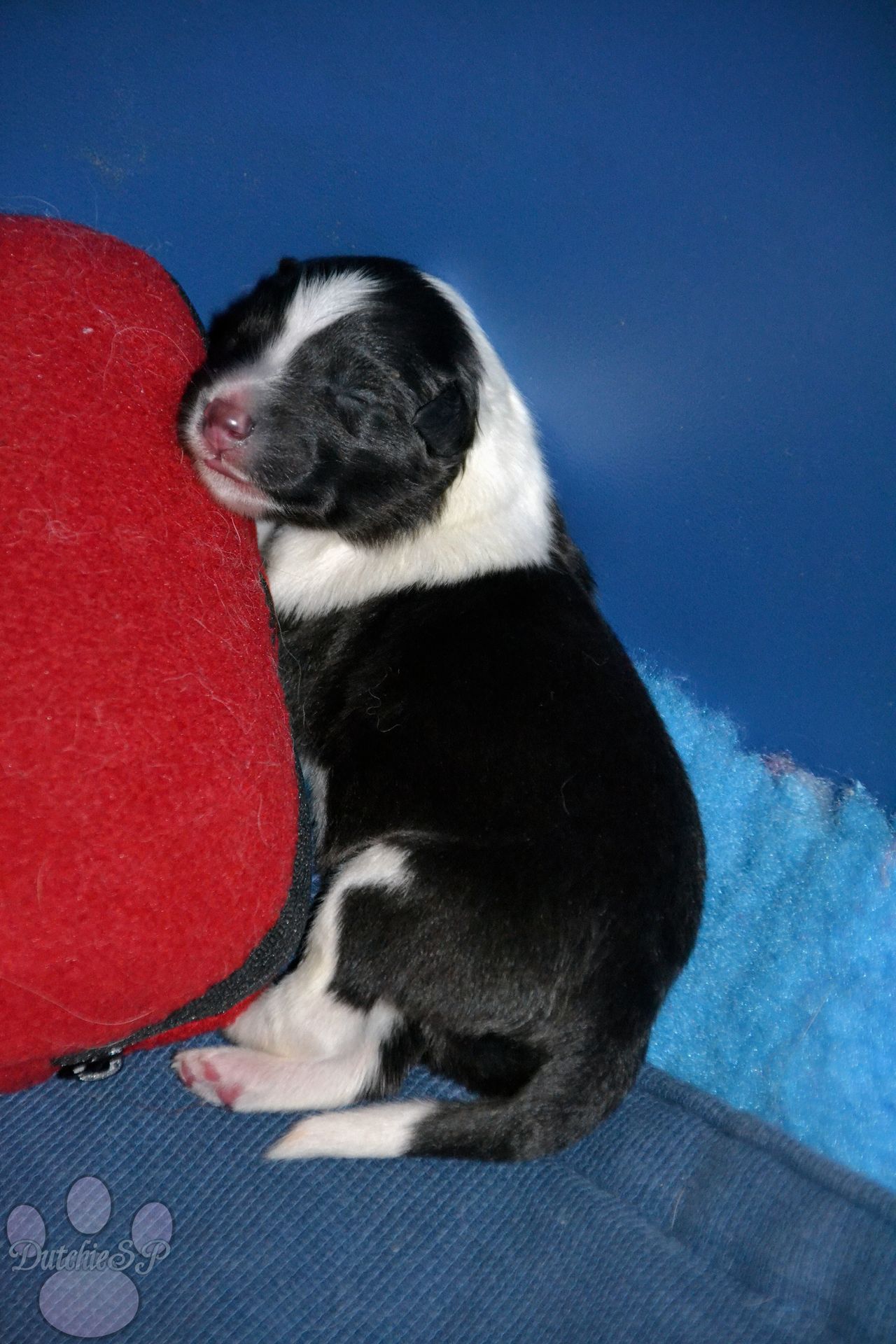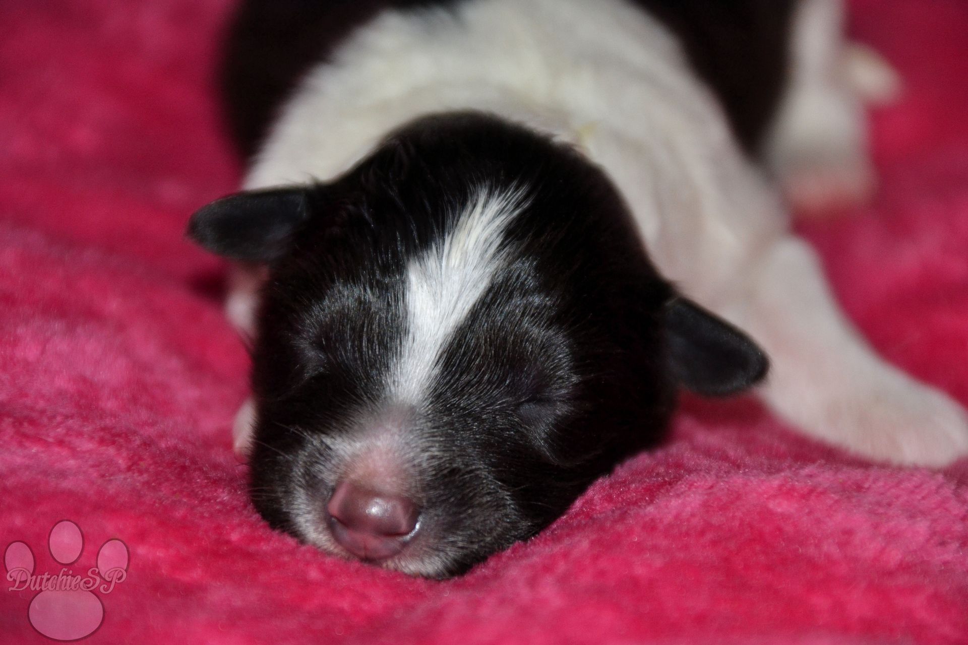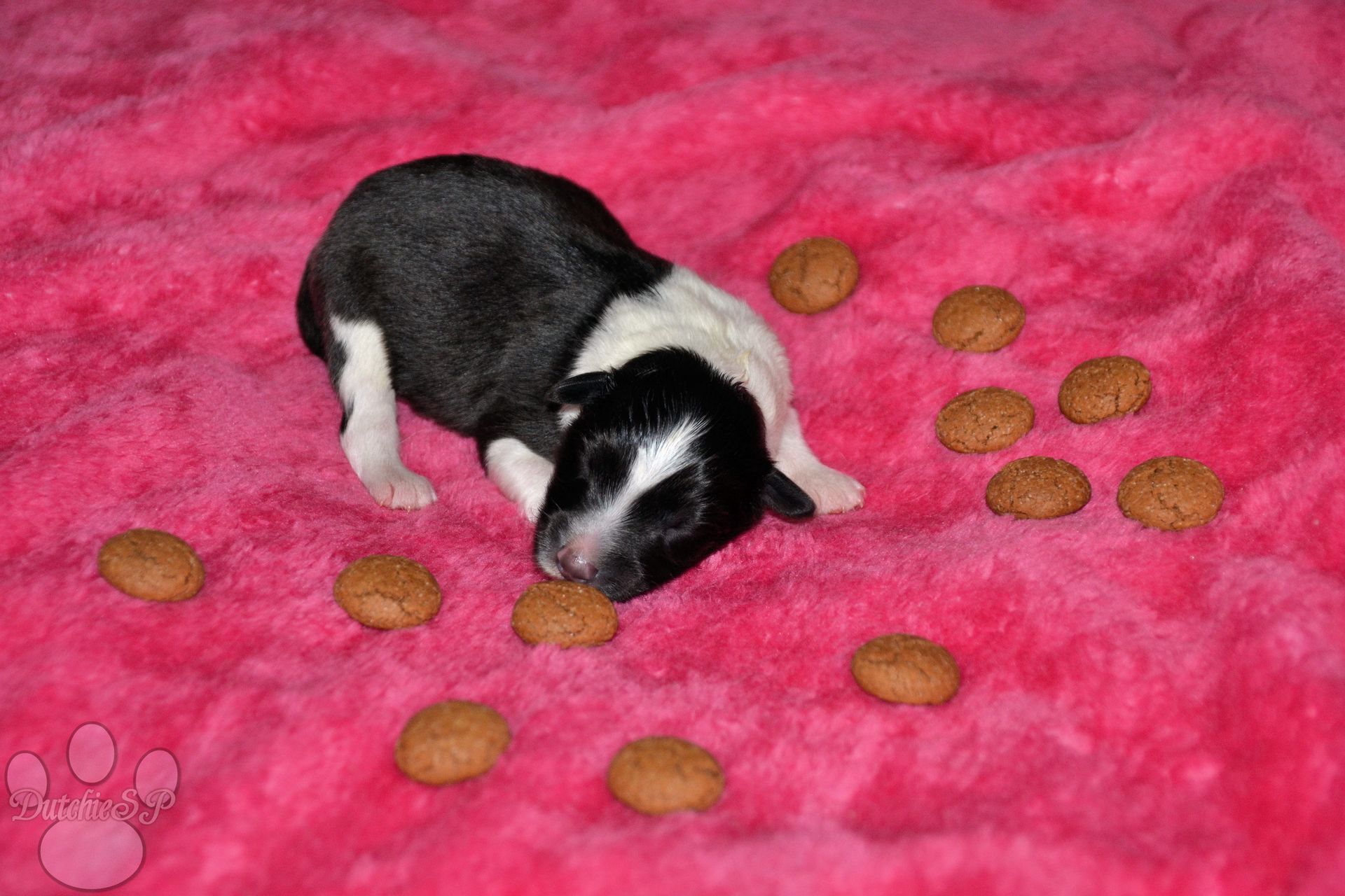 Het eerste pupje kwam om 11.23u ter wereld. Een prachtige bi-black dame met een mooie witte streep op haar hoofdje. Ze is de meest vocale van de groep, gilt het uit als ze iets wil (of niet wil) en kan ook flink herrie maken tijdens het drinken. Zodra ze bij mama is wordt ze echter rustig en valt ze heerlijk in slaap. Een echt mamaskindje dus. Met een geboortegewicht van 260 gram is het een flinke dame met een mooi glanzende zwarte vacht.