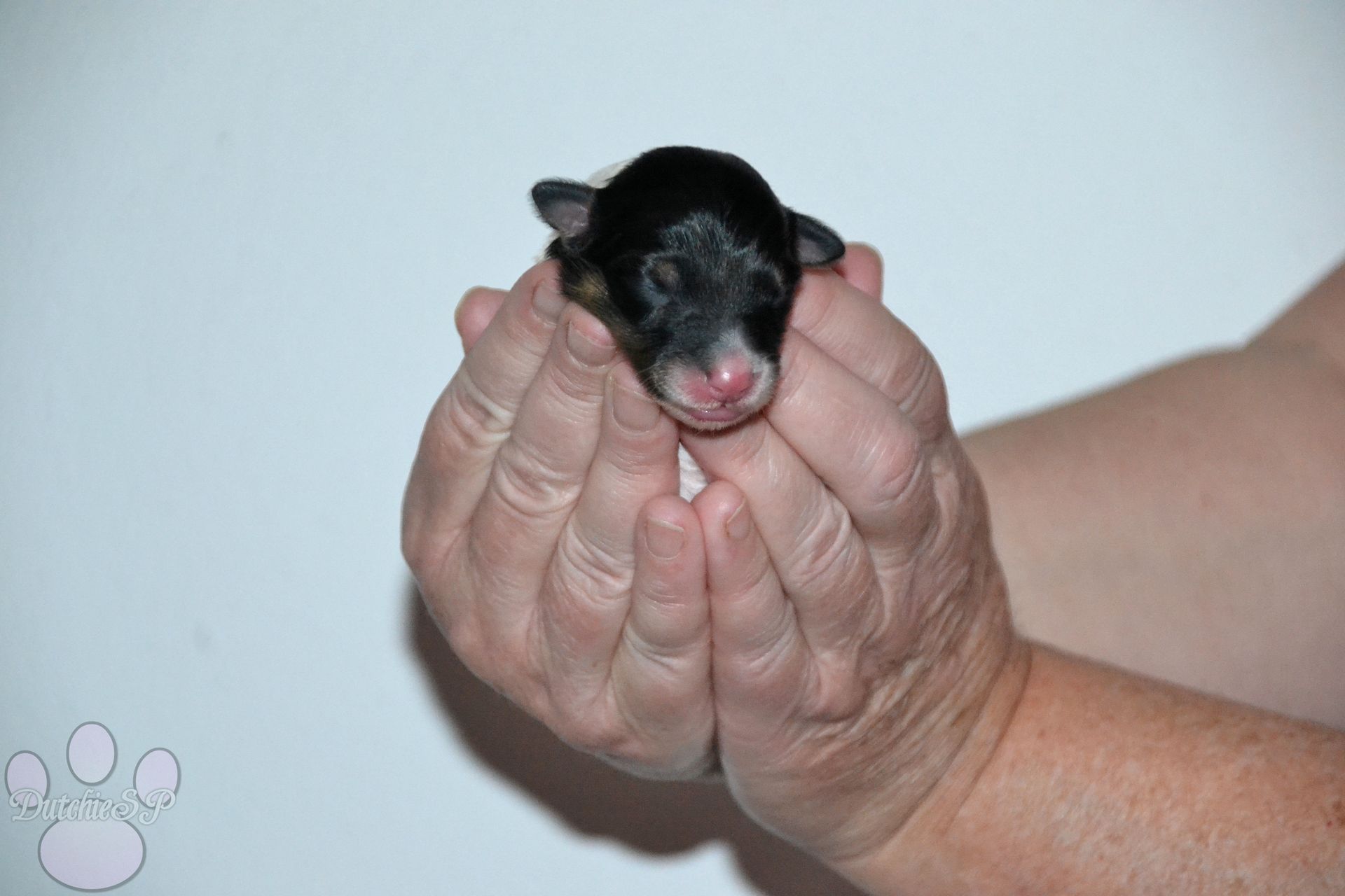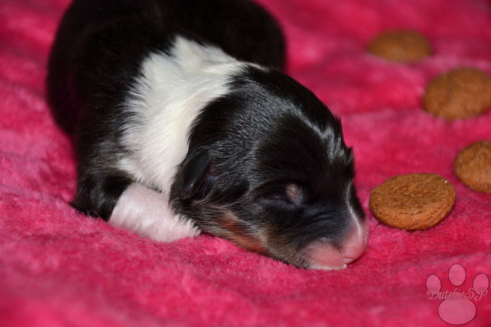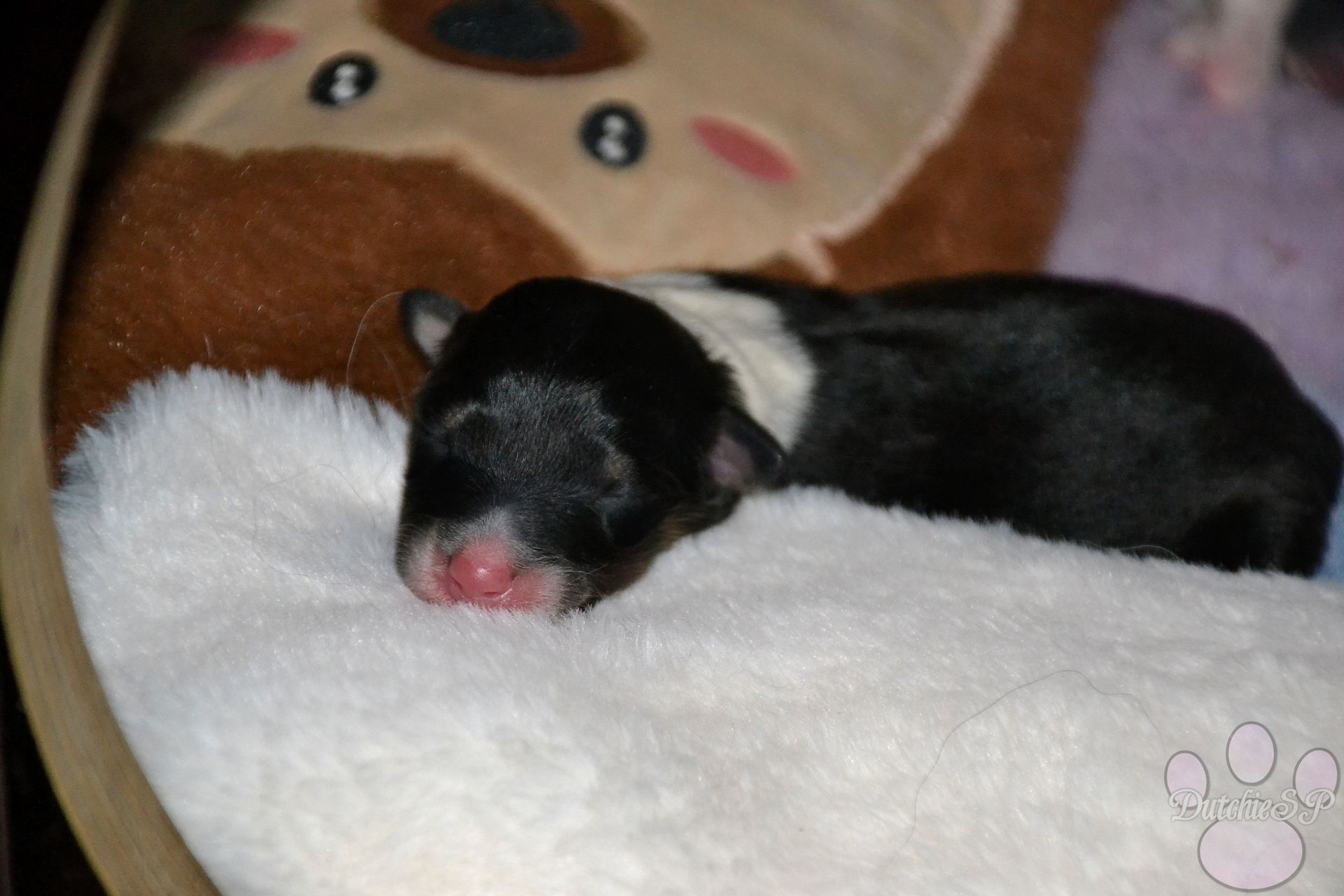 Om 13.10u werd het derde en laatste pupje geboren. Overduidelijk een driekleur meisje, de kleinste van het stel. Ze oogt klein maar is met een geboortegewicht van 237 gram eigenlijk helemaal niet zo klein. Vocaal gezien is ze de rustigste van de drieling maar wat een kracht in de benen heeft deze meid zeg. Ze was veruit het moeilijkste om op de foto te krijgen omdat ze steeds een andere kant op kroop. Ze doet verder ook niet onder voor haar zussen en groeit in even snel tempo met ze mee.