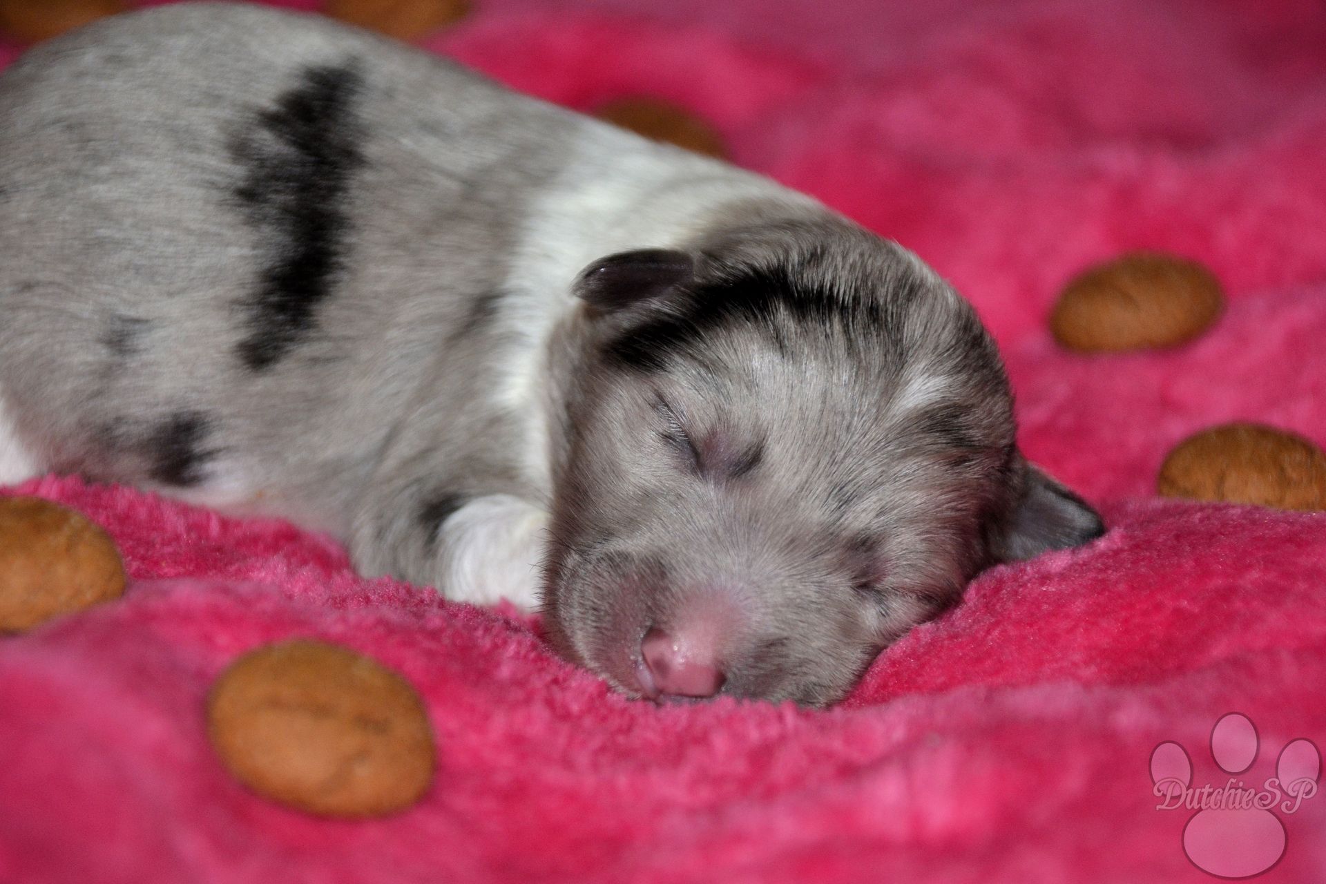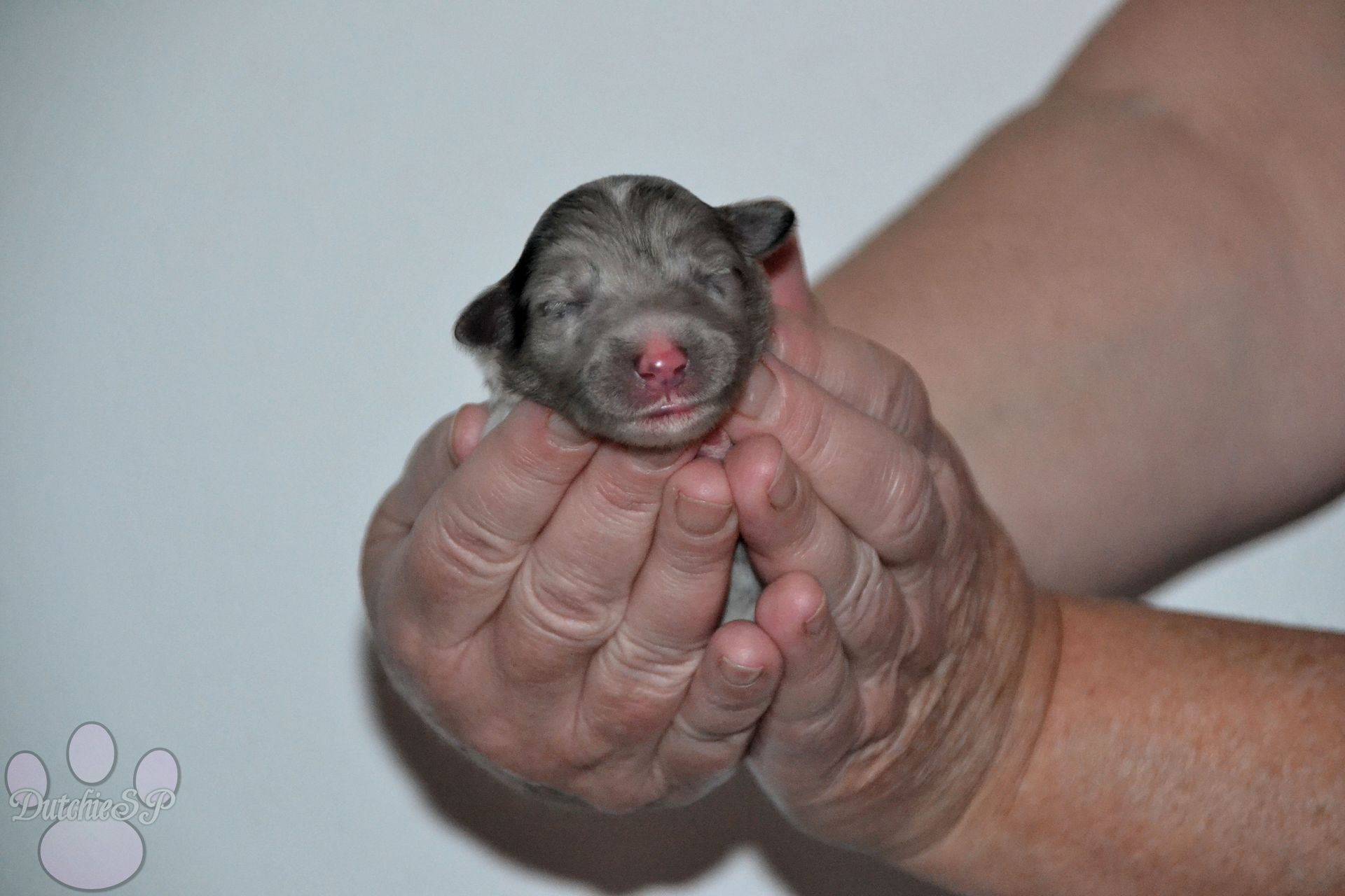 Het tweede pupje was, hoe bijzonder, net zoals de vorige keer een bi-blue meisje dat om 12.32u werd geboren. We zagen al gelijk toen haar kopje eruit kwam dat het een grote pup was, maar zo groot... Dat zagen we niet aankomen! Ze is de grootste pup die we ooit hebben gehad met een geboortegewicht van 312 gram. Ze was bij de geboorte duidelijk een stukje relaxter dan haar oudere zus maar inmiddels laat zij haar stem ook steeds vaker horen. Vooral het drinken gaat regelmatig gepaard met de nodige kreuntjes. Verder is ze echter een tevreden meid die graag lekker ligt te luieren.