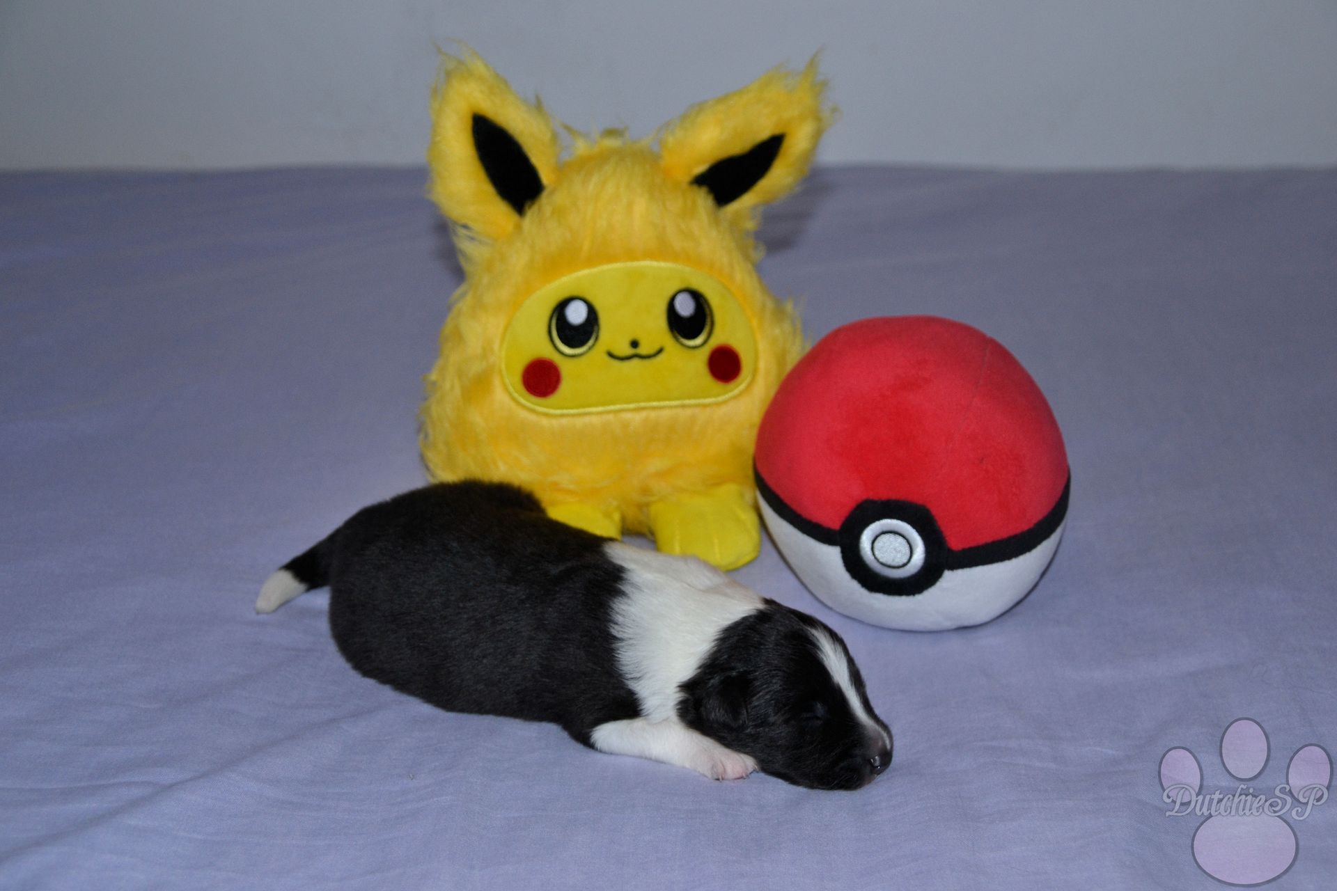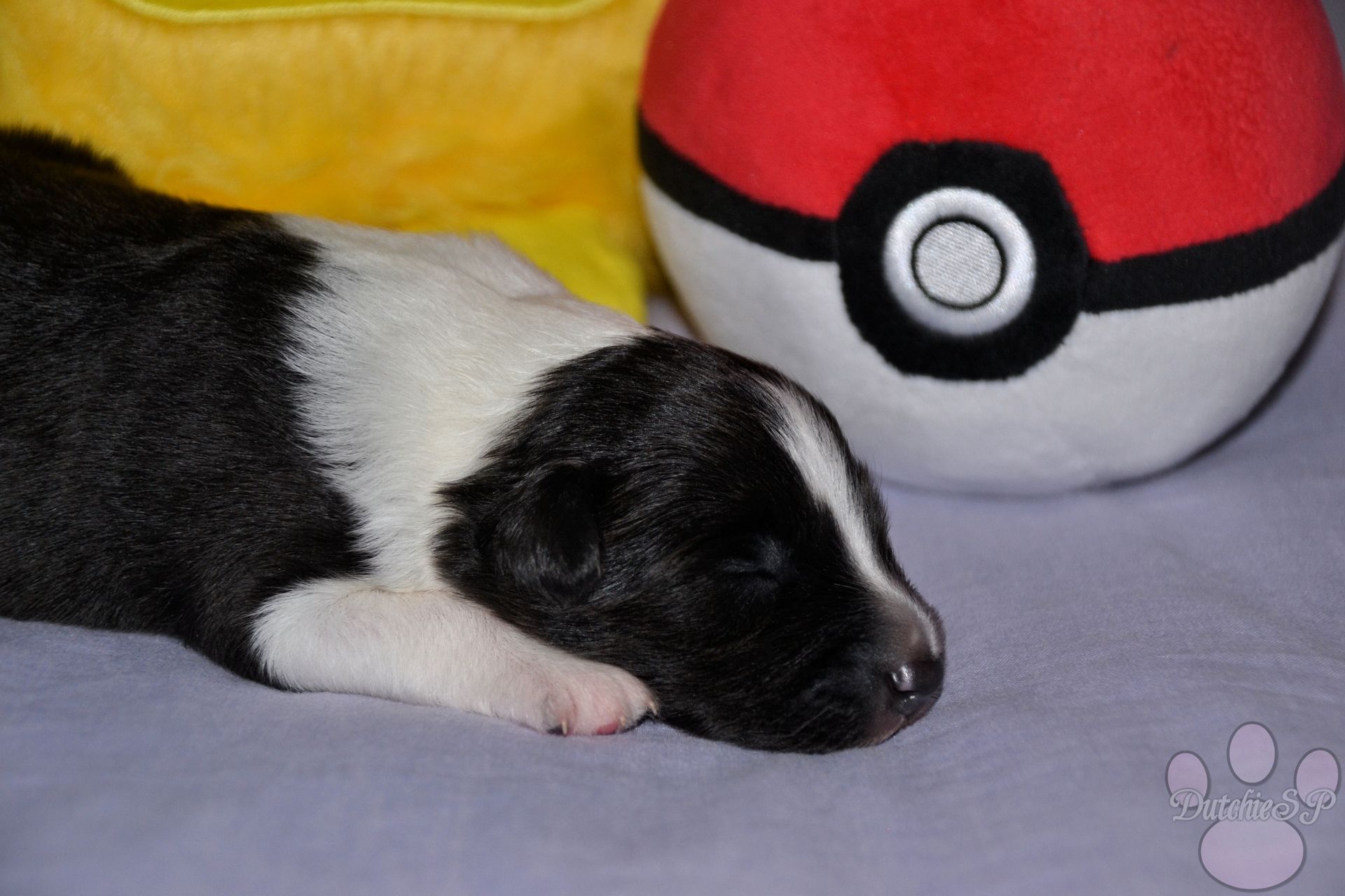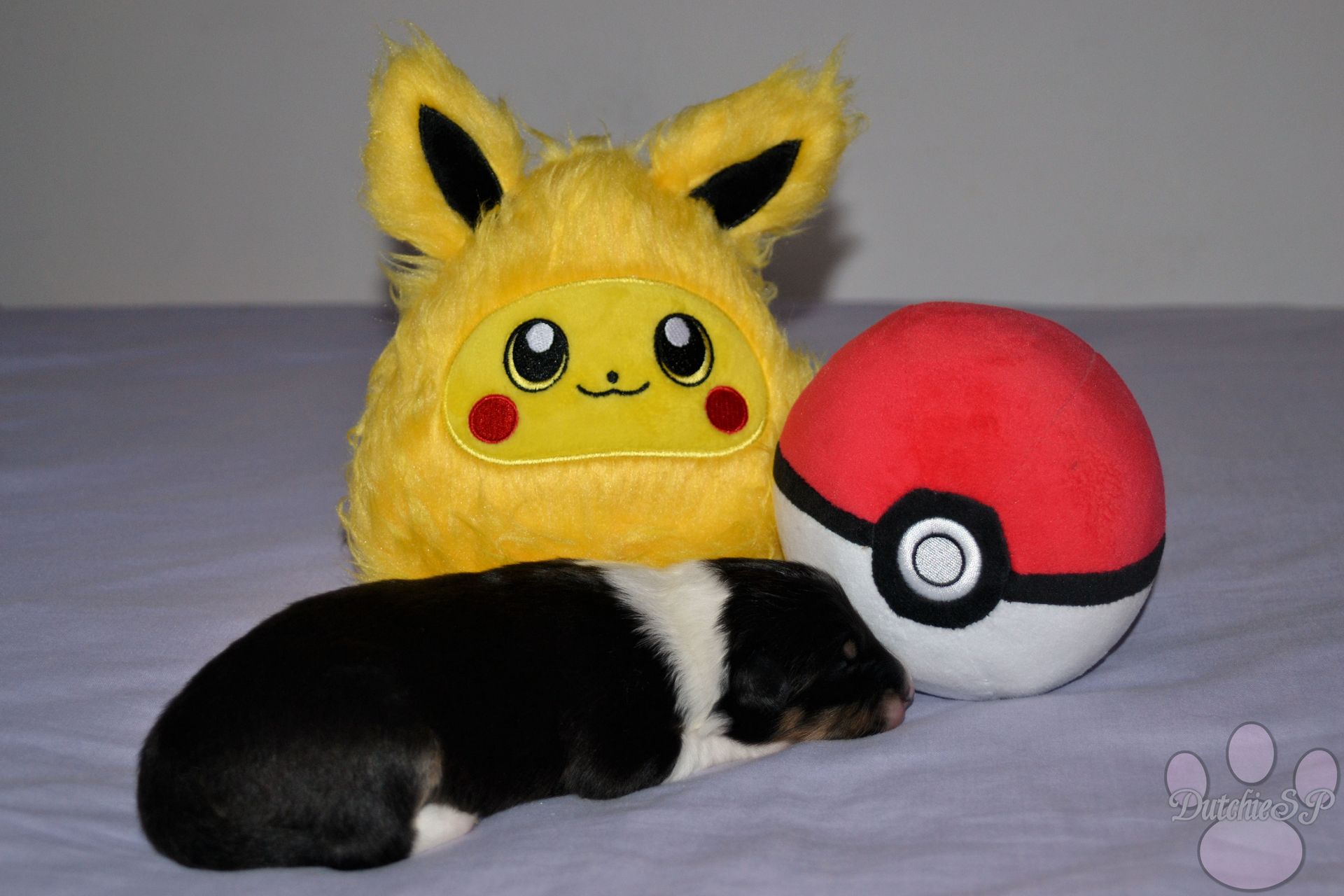 Jiggly is de bewegelijke van de groep. Al tijdens de eerste photoshoot kroop ze het hele bed over en nu nog steeds gaat ze met gemak de hele werpkist door. Ze kan wat zeurderig worden als ze knuffels wil maar dit is gemakkelijk op te lossen door een zoen van mama of een slaapje op onze borst. Ze heeft graag een kussen onder haar hoofdje, of dit nu een kruik, een hand, een poot van mama of één van haar zussen is... Zolang het maar zacht ligt. In het geval van de naam van Jiggly was het eerst de 'Jolly' die we hadden bedacht. Jolly, wat jolig betekent, en natuurlijk ook een woord is wat vaak rond de kerstdagen gebruikt wordt vond ik zo leuk dat ik hier gewoon een tweede naam bij wilde bedenken. Nu zijn er niet heel veel Pokémon met namen die met een J beginnen, laat staan schattige. Jigglypuff is zo een Pokémon waar ik niet gelijk aan dacht maar die ik eigenlijk wel super leuk vind. Jigglypuff is een zingende Pokémon wiens stem anderen in slaap kan brengen, iets wat de Pokémon zelf overigens niet op prijs stelt. Hun evolutie vindt plaats op basis van hoe hecht de vriendschap tussen Pokémon en mens is en zo een band hoop ik ook te vinden voor onze Jiggly in het echte leven. Jigglypuff is een speelse Pokémon die gek is op aandacht en dit laatste is nu al toepasselijk op onze puppy Jiggly.