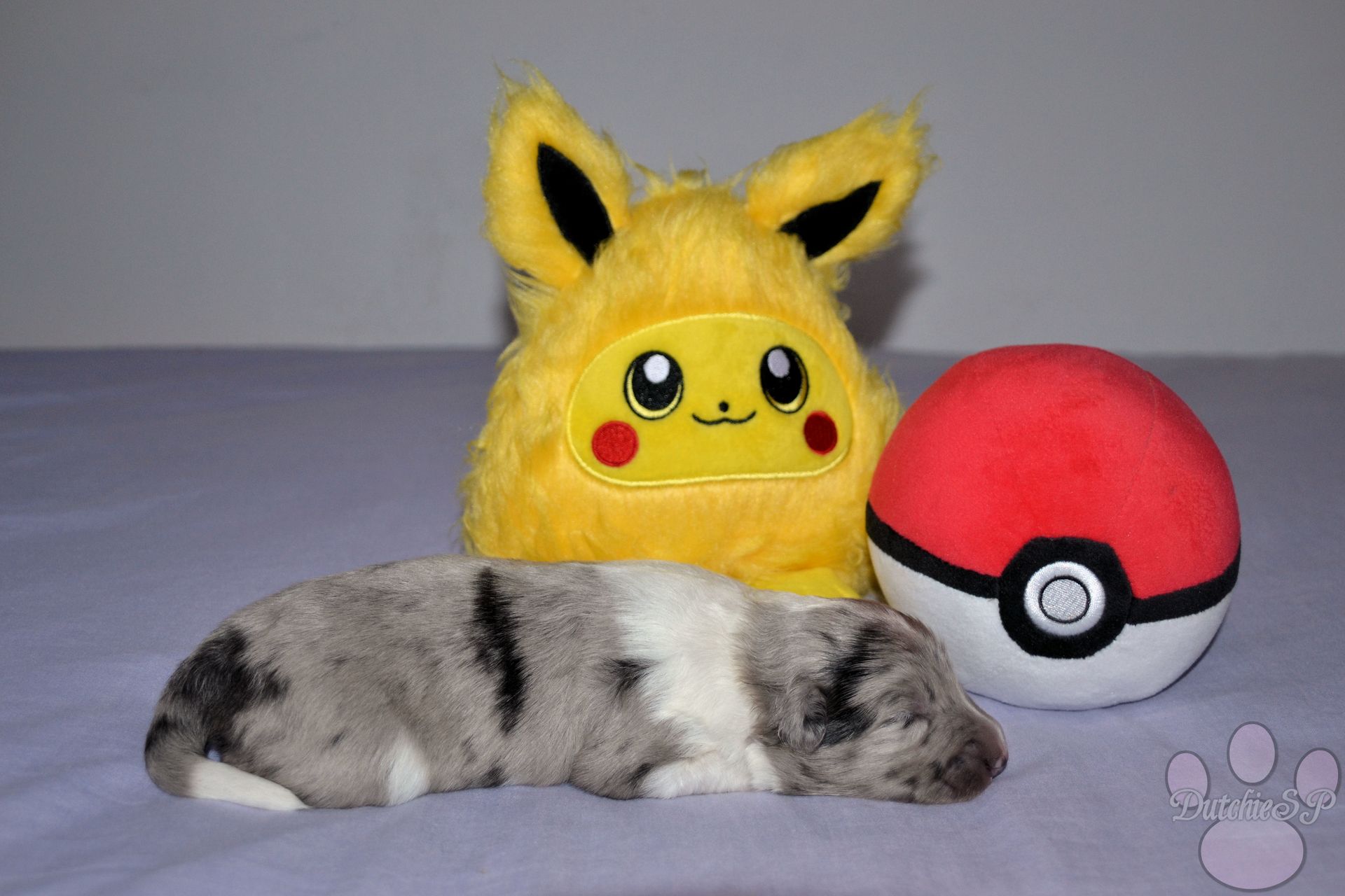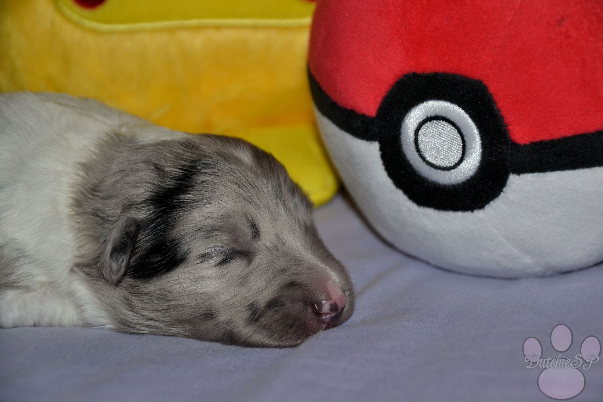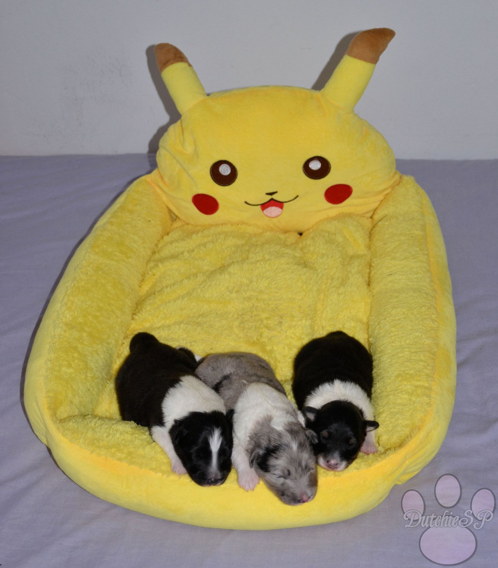 Jiggly is de bewegelijke van de groep. Al tijdens de eerste photoshoot kroop ze het hele bed over en nu nog steeds gaat ze met gemak de hele werpkist door. Ze kan wat zeurderig worden als ze knuffels wil maar dit is gemakkelijk op te lossen door een zoen van mama of een slaapje op onze borst. Ze heeft graag een kussen onder haar hoofdje, of dit nu een kruik, een hand, een poot van mama of één van haar zussen is... Zolang het maar zacht ligt. In het geval van de naam van Jiggly was het eerst de 'Jolly' die we hadden bedacht. Jolly, wat jolig betekent, en natuurlijk ook een woord is wat vaak rond de kerstdagen gebruikt wordt vond ik zo leuk dat ik hier gewoon een tweede naam bij wilde bedenken. Nu zijn er niet heel veel Pokémon met namen die met een J beginnen, laat staan schattige. Jigglypuff is zo een Pokémon waar ik niet gelijk aan dacht maar die ik eigenlijk wel super leuk vind. Jigglypuff is een zingende Pokémon wiens stem anderen in slaap kan brengen, iets wat de Pokémon zelf overigens niet op prijs stelt. Hun evolutie vindt plaats op basis van hoe hecht de vriendschap tussen Pokémon en mens is en zo een band hoop ik ook te vinden voor onze Jiggly in het echte leven. Jigglypuff is een speelse Pokémon die gek is op aandacht en dit laatste is nu al toepasselijk op onze puppy Jiggly.