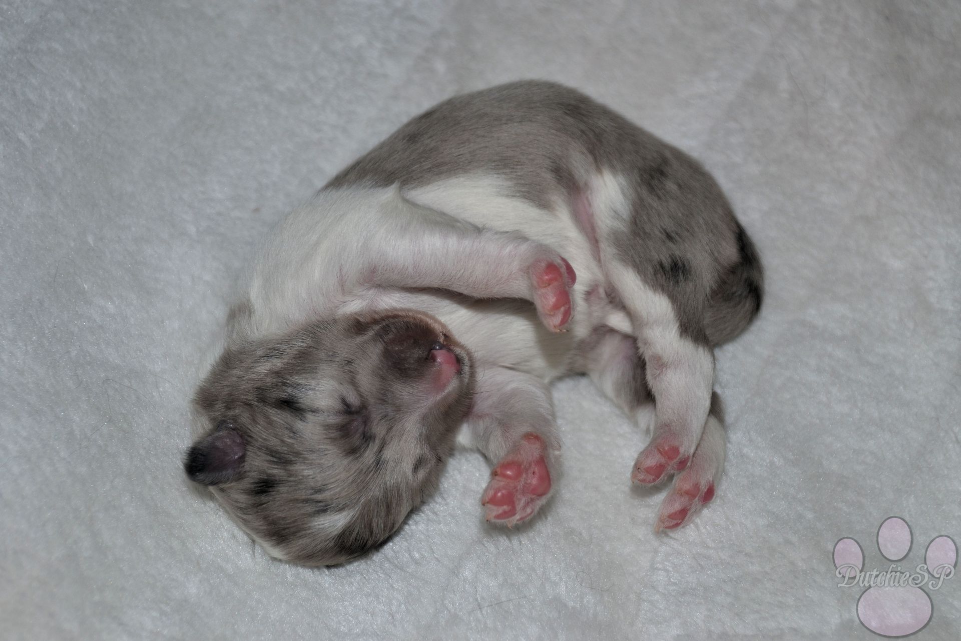 Marill is veruit de luidste drinker van de groep. Als ze aan de melkbar van mama ligt horen we regelmatig kreuntjes en miepjes. Ze is een flinke dame en we zijn dan ook erg benieuwd of ze dit grote formaat blijft houden gedurende haar groei. Met foto's maken is ze de makkelijkste van het stel. Ze ligt het snelste stil van iedereen en kan op veel plekken een comfortabele slaaphouding vinden. Ze is graag dichtbij mama en slaapt ook regelmatig dicht tegen Bloom aan. De naam van de Pokémon Marill stond al een tijdje op mijn lijst, specifiek voor een merle dametje. Marill is immers een blauwe Pokémon dus alleen al daarom vond ik de naam uitermate geschikt voor een hond van die kleur. Marill houdt van water en hoewel het nog afwachten is of dat voor deze pup gaat gelden, zit deze karaktereigenschap wel in de familie. Deze Pokémon staat bekend om z'n vriendelijke en zorgzame karakter, en heeft een goed gehoor. Waar 'Merry' vandaan komt is denk ik wel duidelijk, 'Merry Christmas' is immers iets wat je maar wat vaak hoort gedurende de decembermaand. Merry, oftewel vrolijk, vond ik daarom de perfecte toevoeging aan de naam van deze kleine, grote dame.