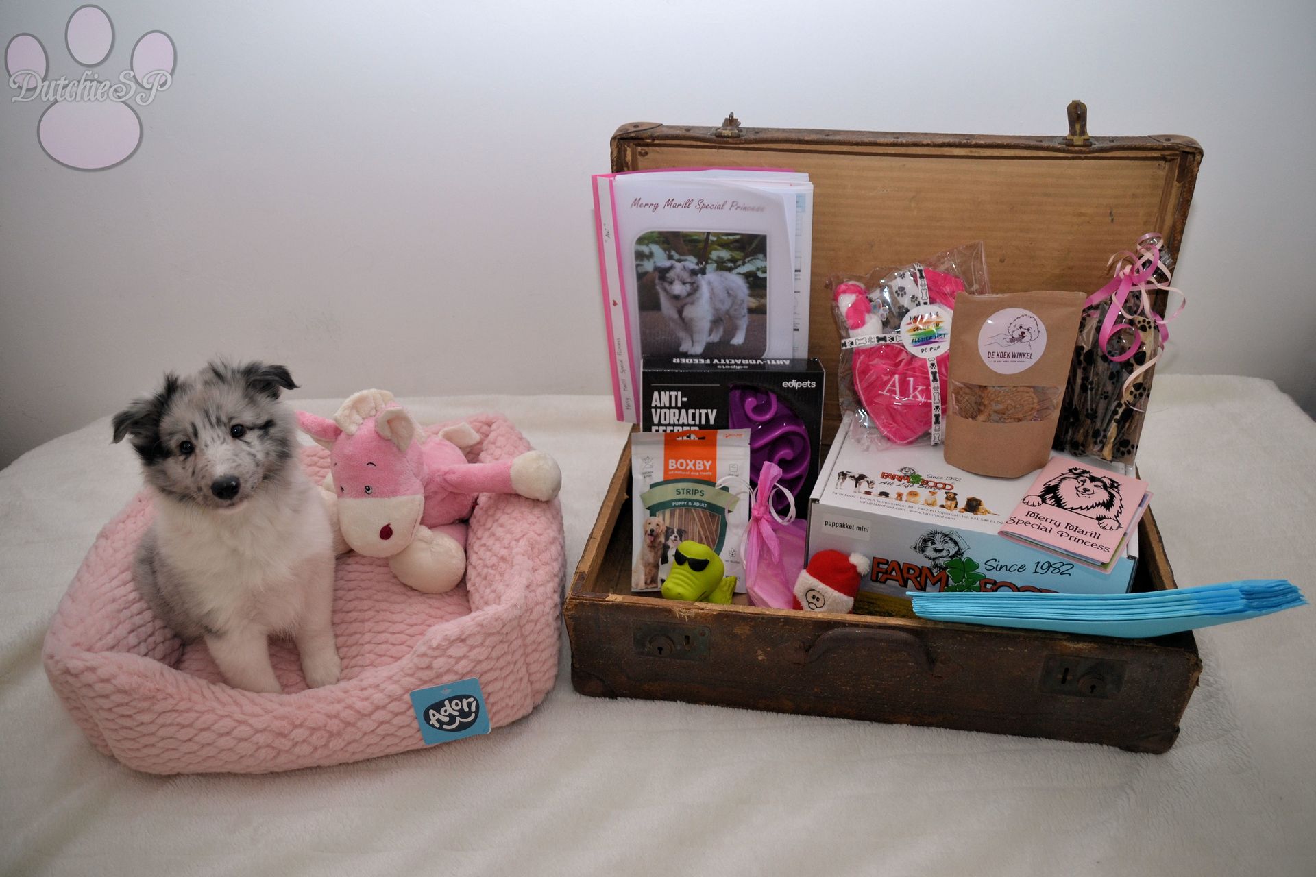 Aki, acht weken oud, klaar om uit te vliegen met haar puppypakket