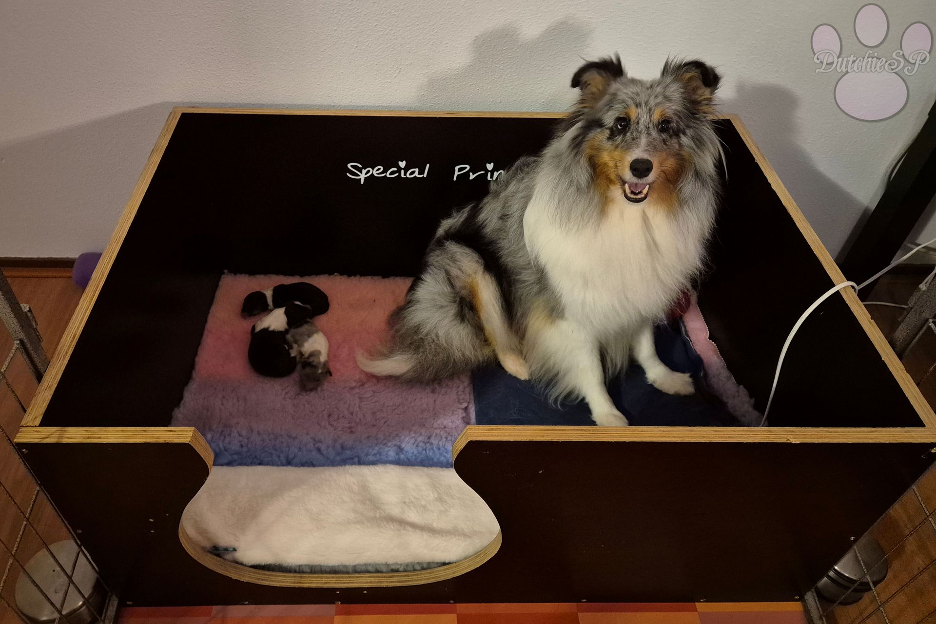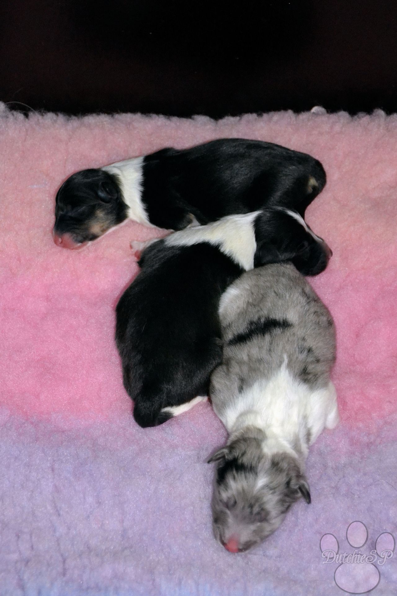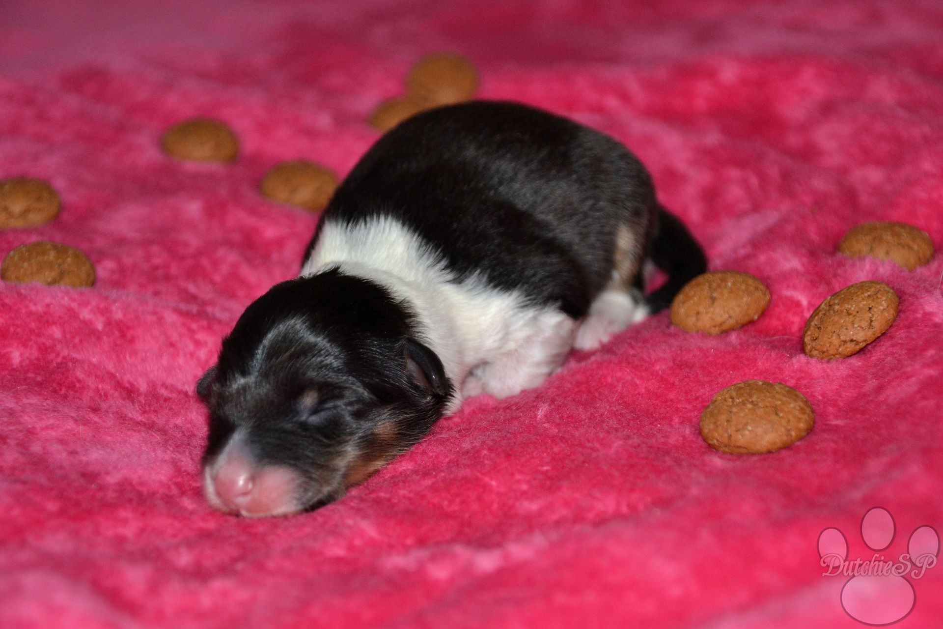 Om 13.10u werd het derde en laatste pupje geboren. Overduidelijk een driekleur meisje, de kleinste van het stel. Ze oogt klein maar is met een geboortegewicht van 237 gram eigenlijk helemaal niet zo klein. Vocaal gezien is ze de rustigste van de drieling maar wat een kracht in de benen heeft deze meid zeg. Ze was veruit het moeilijkste om op de foto te krijgen omdat ze steeds een andere kant op kroop. Ze doet verder ook niet onder voor haar zussen en groeit in even snel tempo met ze mee.