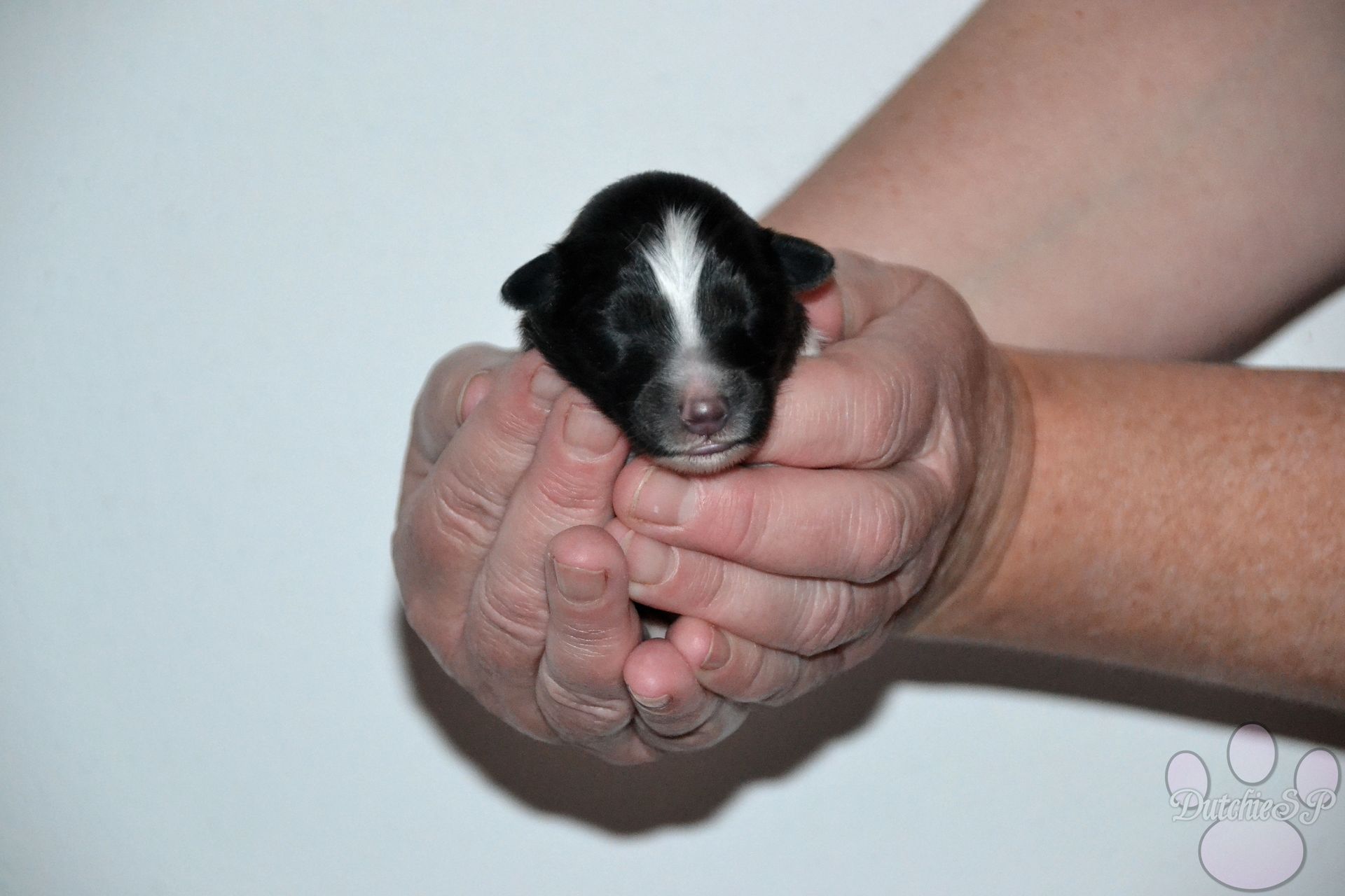 Het eerste pupje kwam om 11.23u ter wereld. Een prachtige bi-black dame met een mooie witte streep op haar hoofdje. Ze is de meest vocale van de groep, gilt het uit als ze iets wil (of niet wil) en kan ook flink herrie maken tijdens het drinken. Zodra ze bij mama is wordt ze echter rustig en valt ze heerlijk in slaap. Een echt mamaskindje dus. Met een geboortegewicht van 260 gram is het een flinke dame met een mooi glanzende zwarte vacht.