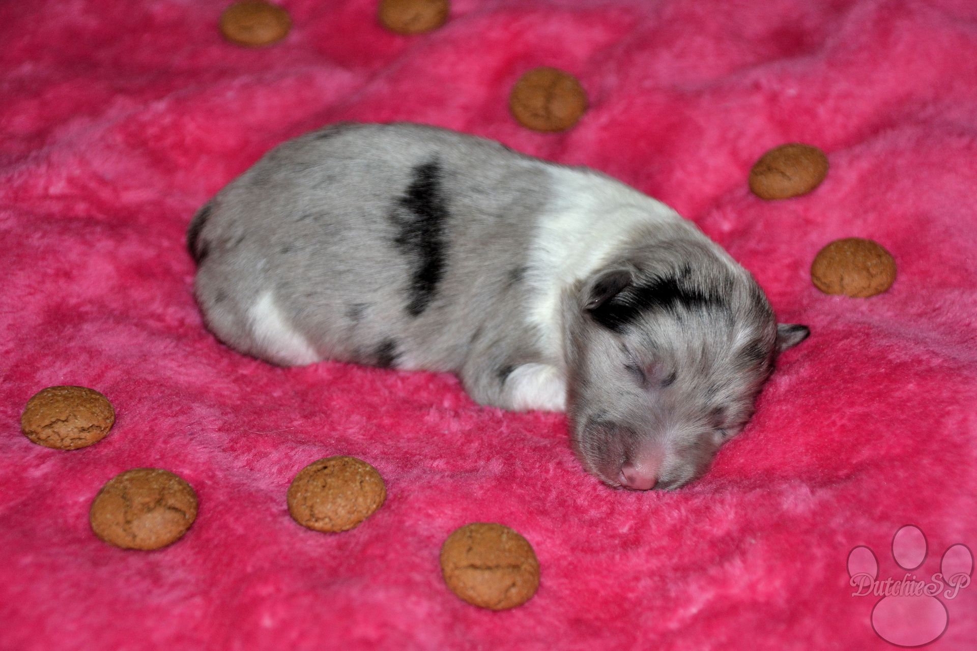 Het tweede pupje was, hoe bijzonder, net zoals de vorige keer een bi-blue meisje dat om 12.32u werd geboren. We zagen al gelijk toen haar kopje eruit kwam dat het een grote pup was, maar zo groot... Dat zagen we niet aankomen! Ze is de grootste pup die we ooit hebben gehad met een geboortegewicht van 312 gram. Ze was bij de geboorte duidelijk een stukje relaxter dan haar oudere zus maar inmiddels laat zij haar stem ook steeds vaker horen. Vooral het drinken gaat regelmatig gepaard met de nodige kreuntjes. Verder is ze echter een tevreden meid die graag lekker ligt te luieren.