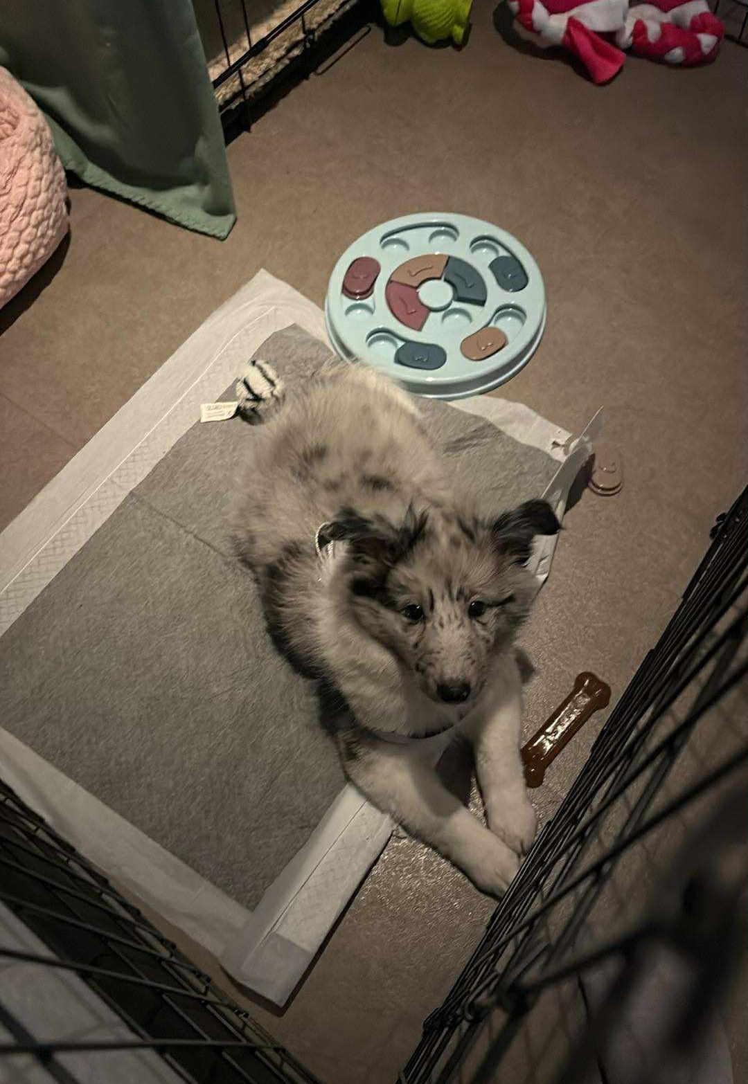 Charlie, acht weken oud, klaar om uit te vliegen met haar puppypakket