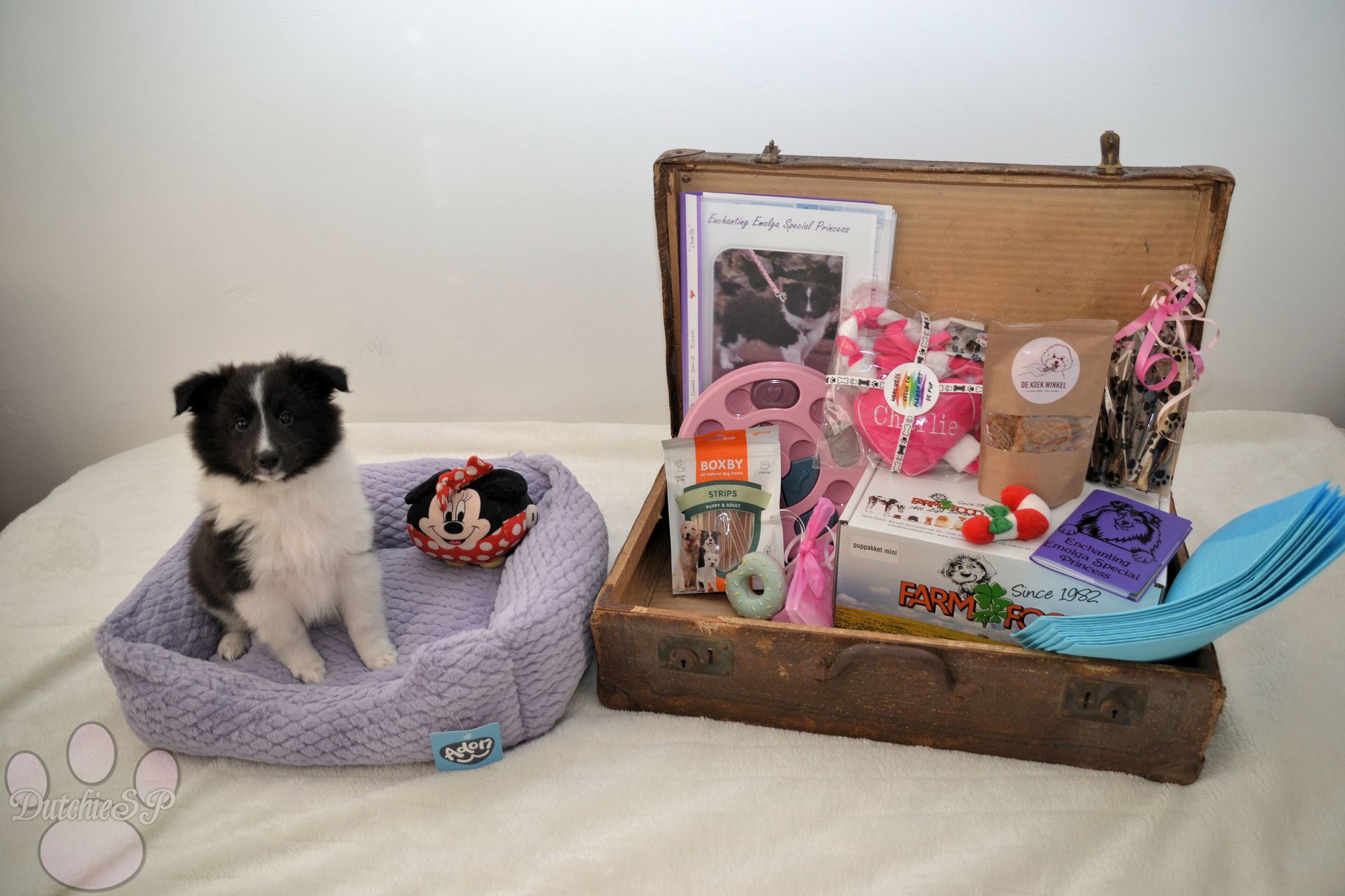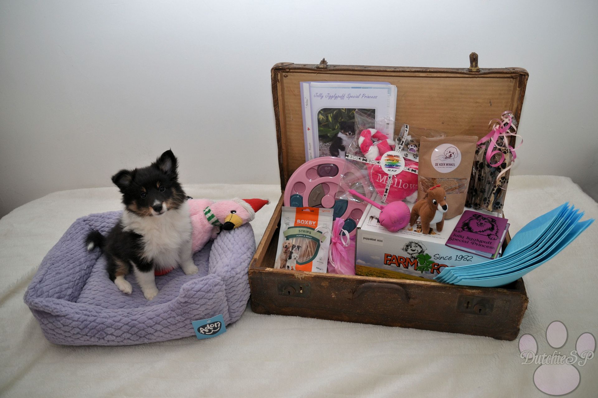 Aki, acht weken oud, klaar om uit te vliegen met haar puppypakket