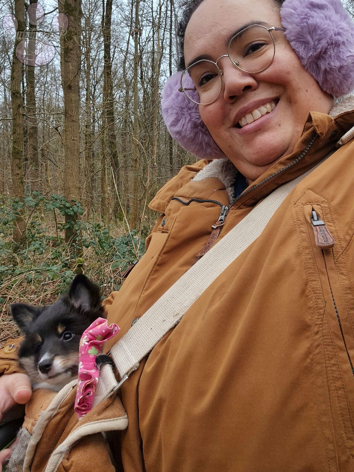 Mellow zat liever nog even in de tas tijdens haar eerste bezoekje aan het bos